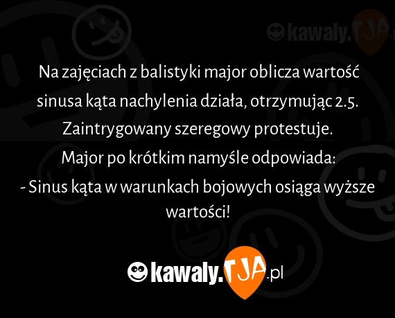 Na zajęciach z balistyki major oblicza wartość sinusa kąta nachylenia działa, otrzymując 2.5. Zaintrygowany szeregowy protestuje. Major po krótkim namyśle odpowiada: - Sinus kąta w warunkach bojowych osiąga wyższe wartości!