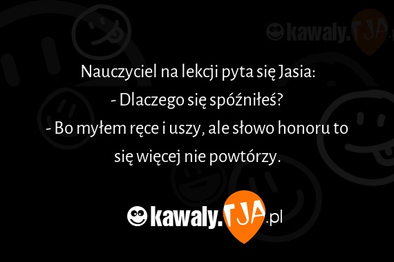 Nauczyciel na lekcji pyta się Jasia: - Dlaczego się spóźniłeś? - Bo myłem ręce i uszy, ale słowo honoru to się więcej nie powtórzy.