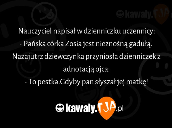 Nauczyciel napisal w dzienniczku uczennicy: - Panska corka Zosia jest nieznosna gadula. Nazajutrz dziewczynka przyniosla dzienniczek z adnotacja ojca: - To pestka.Gdyby pan slyszal jej matke!
