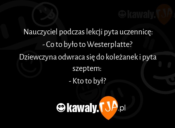 Nauczyciel podczas lekcji pyta uczennice: - Co to bylo to Westerplatte? Dziewczyna odwraca sie do kolezanek i pyta szeptem: - Kto to byl?