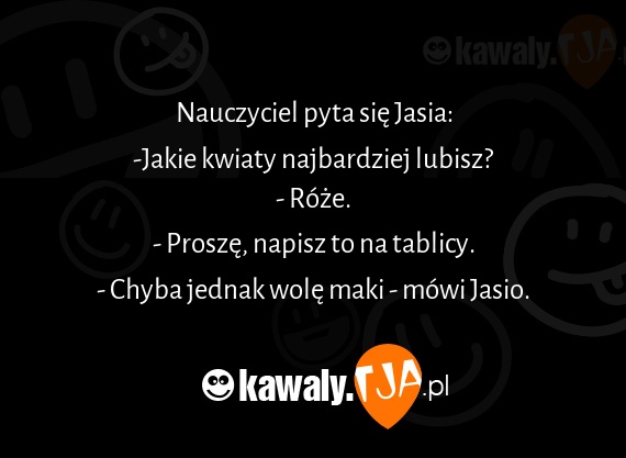 Nauczyciel pyta się Jasia: -Jakie kwiaty najbardziej lubisz? - Róże. - Proszę, napisz to na tablicy. - Chyba jednak wolę maki - mówi Jasio.