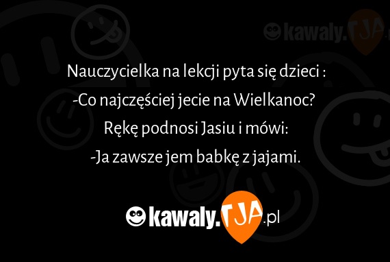 Nauczycielka na lekcji pyta sie dzieci : -Co najczesciej jecie na Wielkanoc? Reke podnosi Jasiu i mowi: -Ja zawsze jem babke z jajami.