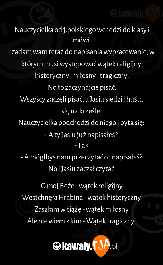 - zadam wam teraz do napisania wypracowanie, w którym musi występować wątek religijny, historyczny, miłosny i tragiczny.