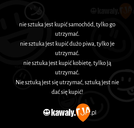 nie sztuka jest kupic samochod, tylko go utrzymac. nie sztuka jest kupic duzo piwa, tylko je utrzymac. nie sztuka jest kupic kobiete, tylko ja utrzymac. Nie sztuka jest sie utrzymac, sztuka jest nie dac sie kupic!