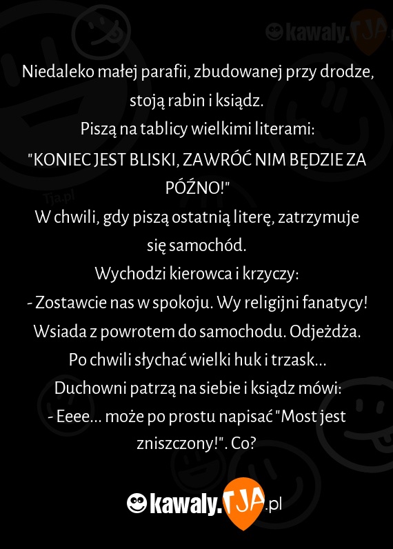 Niedaleko małej parafii, zbudowanej przy drodze, stoją rabin i ksiądz.