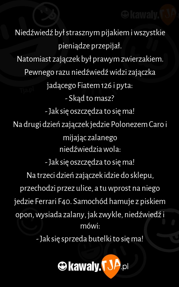 Natomiast zajączek był prawym zwierzakiem. Pewnego razu niedźwiedź widzi zajączka jadącego Fiatem 126 i pyta: