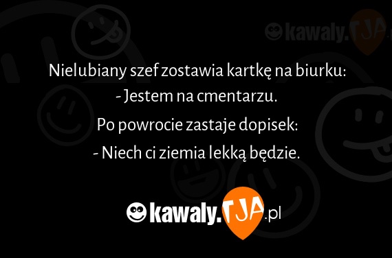 Nielubiany szef zostawia kartkę na biurku: - Jestem na cmentarzu. Po powrocie zastaje dopisek: - Niech ci ziemia lekką będzie.