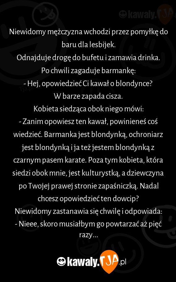 - Zanim opowiesz ten kawał, powinieneś coś wiedzieć. Barmanka jest blondynką, ochroniarz jest blondynką i ja też jestem blondynką z czarnym pasem karate. Poza tym kobieta, która siedzi obok mnie, jest kulturystką, a dziewczyna po Twojej prawej stronie zapaśniczką. Nadal chcesz opowiedzieć ten dowcip?