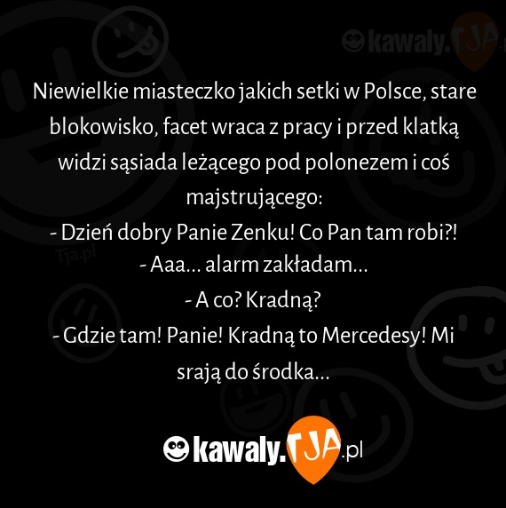 Niewielkie miasteczko jakich setki w Polsce, stare blokowisko, facet wraca z pracy i przed klatką widzi sąsiada leżącego pod polonezem i coś majstrującego: