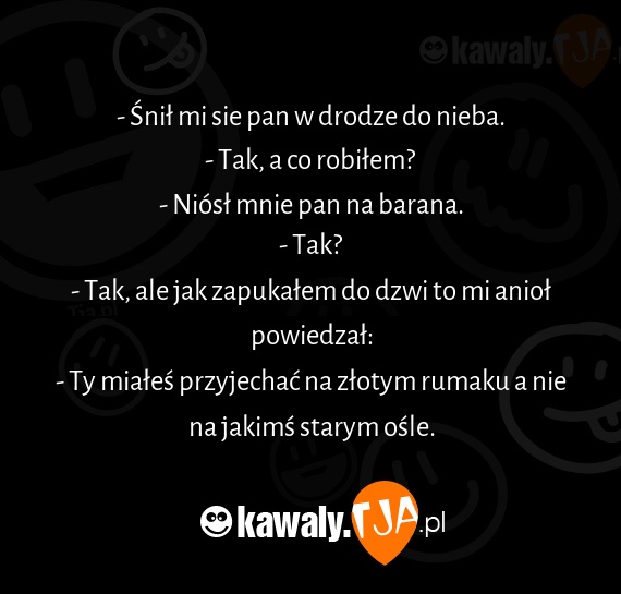 - Śnił mi sie pan w drodze do nieba. - Tak, a co robiłem? - Niósł mnie pan na barana. - Tak? - Tak, ale jak zapukałem do dzwi to mi anioł powiedzał: - Ty miałeś przyjechać na złotym rumaku a nie na jakimś starym ośle.