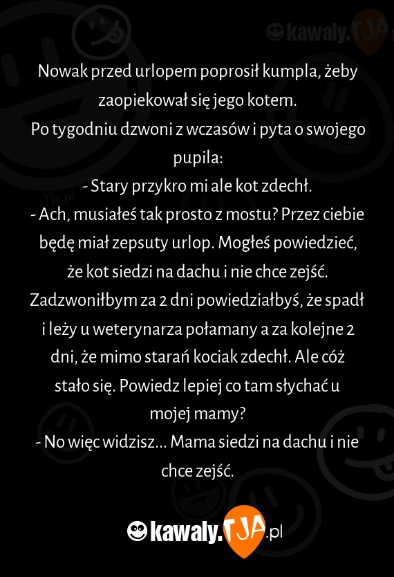 - Ach, musiałeś tak prosto z mostu? Przez ciebie będę miał zepsuty urlop. Mogłeś powiedzieć, że kot siedzi na dachu i nie chce zejść. Zadzwoniłbym za 2 dni powiedziałbyś, że spadł i leży u weterynarza połamany a za kolejne 2 dni, że mimo starań kociak zdechł. Ale cóż stało się. Powiedz lepiej co tam słychać u mojej mamy?
