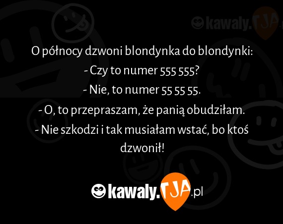 O polnocy dzwoni blondynka do blondynki: - Czy to numer 555 555? - Nie, to numer 55 55 55. - O, to przepraszam, ze pania obudzilam. - Nie szkodzi i tak musialam wstac, bo ktos dzwonil!