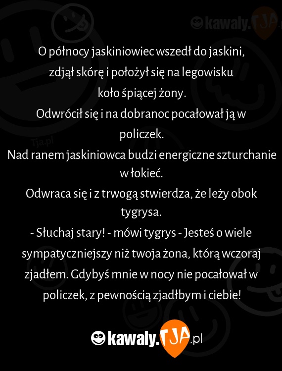 - Słuchaj stary! - mówi tygrys - Jesteś o wiele sympatyczniejszy niż twoja żona, którą wczoraj zjadłem. Gdybyś mnie w nocy nie pocałował w policzek, z pewnością zjadłbym i ciebie!