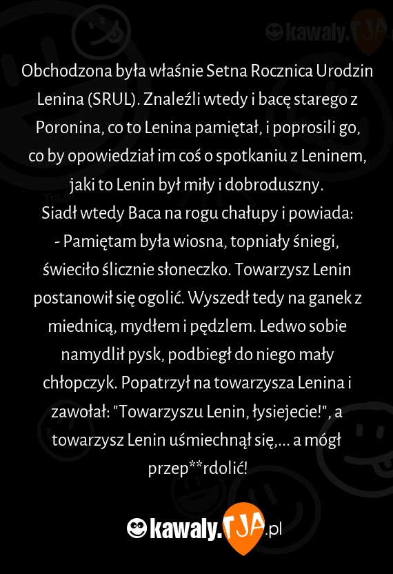 - Pamiętam była wiosna, topniały śniegi, świeciło ślicznie słoneczko. Towarzysz Lenin postanowił się ogolić. Wyszedł tedy na ganek z miednicą, mydłem i pędzlem. Ledwo sobie namydlił pysk, podbiegł do niego mały chłopczyk. Popatrzył na towarzysza Lenina i zawołał: "Towarzyszu Lenin, łysiejecie!", a towarzysz Lenin uśmiechnął się,... a mógł przypierdolić!