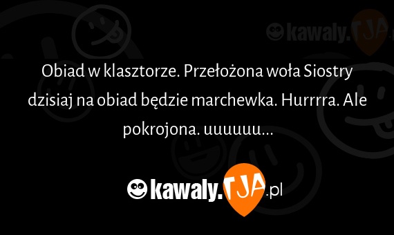 [url=https://kawaly.tja.pl/dowcip,obiad-w-klasztorze-przelozona-wola]Obiad w klasztorze. Przełożona woła Siostry dzisiaj na obiad będzie marchewka. Hurrrra. Ale pokrojona. uuuuuu...[/url]