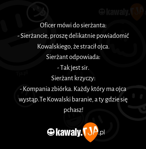 Oficer mowi do sierzanta: - Sierzancie, prosze delikatnie powiadomic Kowalskiego, ze stracil ojca. Sierzant odpowiada: - Tak jest sir. Sierzant krzyczy: - Kompania zbiorka. Kazdy ktory ma ojca wystap.Te Kowalski baranie, a ty gdzie sie pchasz!