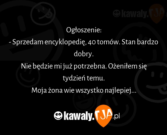 Ogłoszenie: - Sprzedam encyklopedię, 40 tomów. Stan bardzo dobry. Nie będzie mi już potrzebna. Ożeniłem się tydzień temu. Moja żona wie wszystko najlepiej...