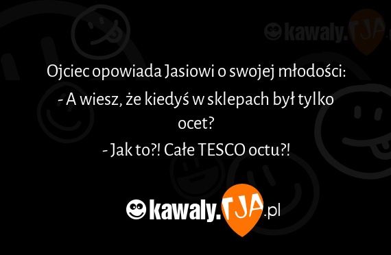 Ojciec opowiada Jasiowi o swojej młodości: - A wiesz, że kiedyś w sklepach był tylko ocet? - Jak to?! Całe TESCO octu?!