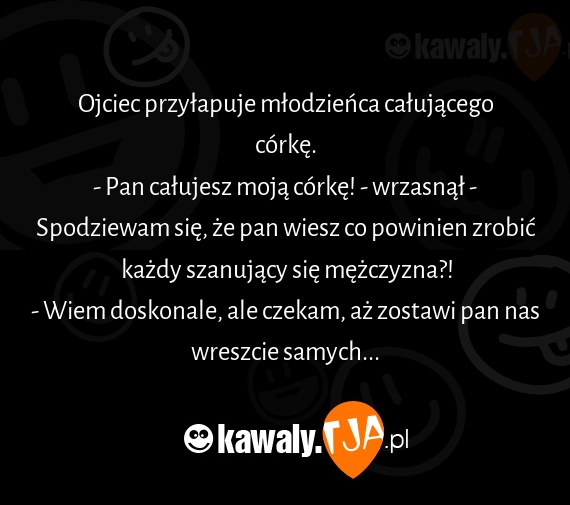 Ojciec przyłapuje młodzieńca całującego córkę. - Pan całujesz moją córkę! - wrzasnął - Spodziewam się, że pan wiesz co powinien zrobić każdy szanujący się mężczyzna?! - Wiem doskonale, ale czekam, aż zostawi pan nas wreszcie samych...