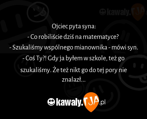 Ojciec pyta syna: - Co robiliście dziś na matematyce? - Szukaliśmy wspólnego mianownika - mówi syn. - Coś Ty?! Gdy ja byłem w szkole, też go szukaliśmy. Że też nikt go do tej pory nie znalazł...