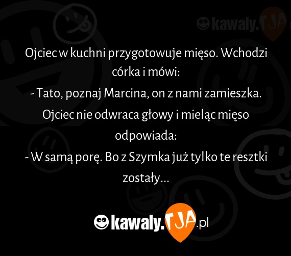 Ojciec w kuchni przygotowuje mieso. Wchodzi corka i mowi: - Tato, poznaj Marcina, on z nami zamieszka. Ojciec nie odwraca glowy i mielac mieso odpowiada: - W sama pore. Bo z Szymka juz tylko te resztki zostaly...