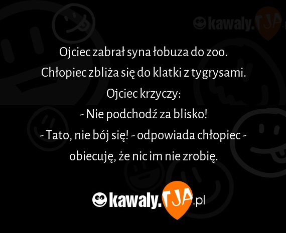 Ojciec zabral syna lobuza do zoo. Chlopiec zbliza sie do klatki z tygrysami. Ojciec krzyczy: - Nie podchodx za blisko! - Tato, nie boj sie! - odpowiada chlopiec - obiecuje, ze nic im nie zrobie.