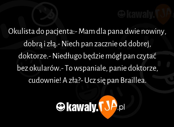 [url=https://kawaly.tja.pl/dowcip,okulista-do-pacjenta-mam-dla]Okulista do pacjenta:- Mam dla pana dwie nowiny, dobrą i złą.- Niech pan zacznie od dobrej, doktorze.- Niedługo będzie mógł pan czytać bez okularów.- To wspaniale, panie doktorze, cudownie! A zła?- Ucz się pan Braillea.[/url]