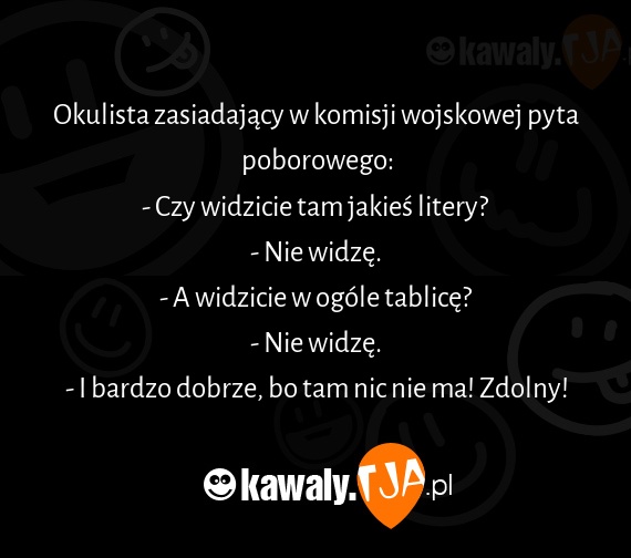 Okulista zasiadający w komisji wojskowej pyta poborowego: - Czy widzicie tam jakieś litery? - Nie widzę. - A widzicie w ogóle tablicę? - Nie widzę. - I bardzo dobrze, bo tam nic nie ma! Zdolny!