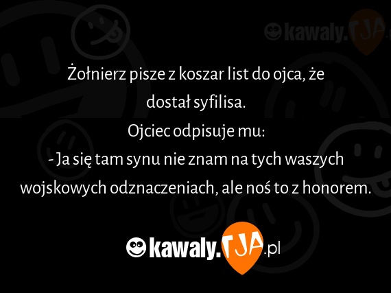 Zolnierz pisze z koszar list do ojca, ze dostal syfilisa. Ojciec odpisuje mu: - Ja sie tam synu nie znam na tych waszych wojskowych odznaczeniach, ale nos to z honorem.