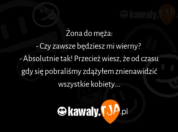 Żona do męża: - Czy zawsze będziesz mi wierny? - Absolutnie tak! Przecież wiesz, że od czasu gdy się pobraliśmy zdążyłem znienawidzić wszystkie kobiety...