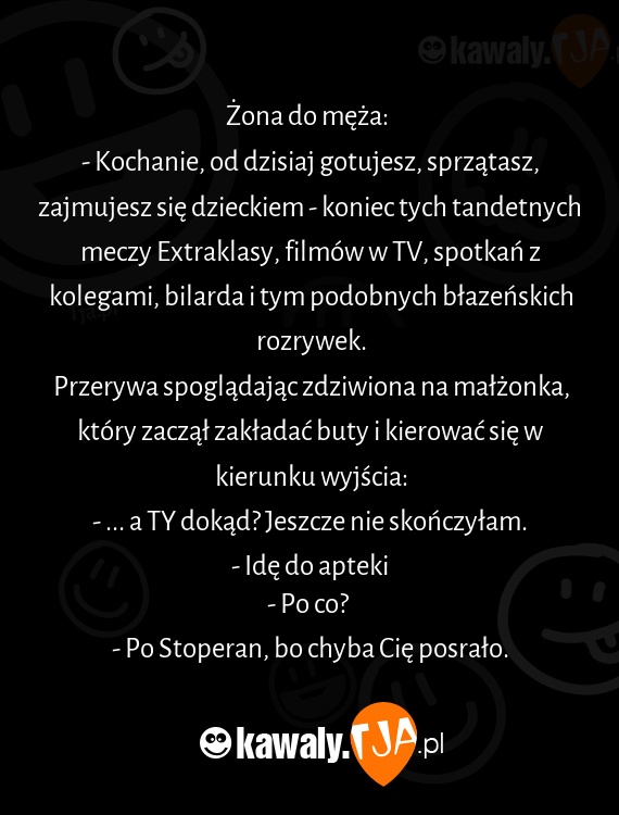 - Kochanie, od dzisiaj gotujesz, sprzątasz, zajmujesz się dzieckiem - koniec tych tandetnych meczy Extraklasy, filmów w TV, spotkań z kolegami, bilarda i tym podobnych błazeńskich rozrywek.