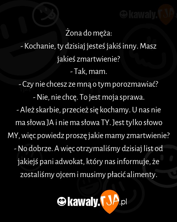- Ależ skarbie, przecież się kochamy. U nas nie ma słowa JA i nie ma słowa TY. Jest tylko słowo MY, więc powiedz proszę jakie mamy zmartwienie?