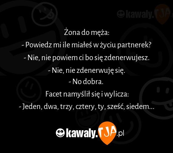 Żona do męża: - Powiedz mi ile miałeś w życiu partnerek? - Nie, nie powiem ci bo się zdenerwujesz. - Nie, nie zdenerwuję się. - No dobra. Facet namyślił się i wylicza: - Jeden, dwa, trzy, cztery, ty, sześć, siedem...
