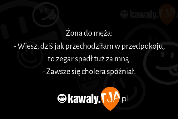 Zona do meza: - Wiesz, dzis jak przechodzilam w przedpokoju, to zegar spadl tuz za mna. - Zawsze sie cholera spoxnial.