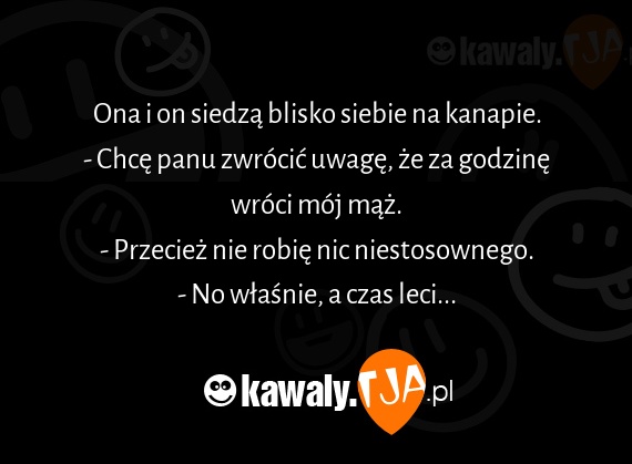 Ona i on siedza blisko siebie na kanapie. - Chce panu zwrocic uwage, ze za godzine wroci moj maz. - Przeciez nie robie nic niestosownego. - No wlasnie, a czas leci...