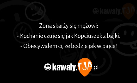 Zona skarzy sie mezowi: - Kochanie czuje sie jak Kopciuszek z bajki. - Obiecywalem ci, ze bedzie jak w bajce!
