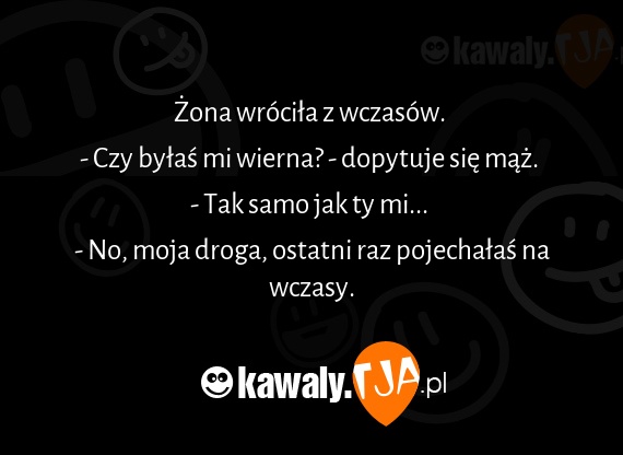 Żona wróciła z wczasów. - Czy byłaś mi wierna? - dopytuje się mąż. - Tak samo jak ty mi... - No, moja droga, ostatni raz pojechałaś na wczasy.