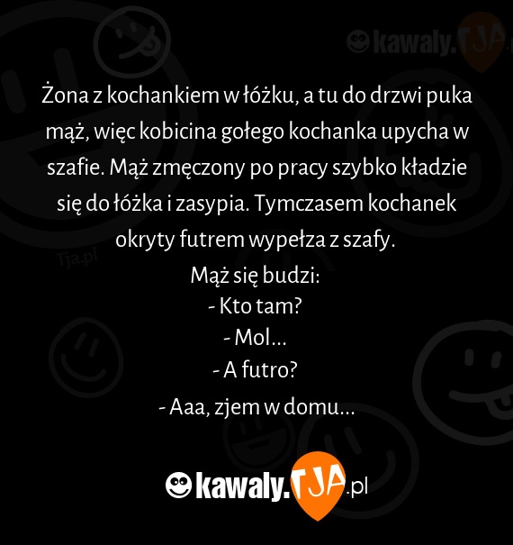 Żona z kochankiem w łóżku, a tu do drzwi puka mąż, więc kobicina gołego kochanka upycha w szafie. Mąż zmęczony po pracy szybko kładzie się do łóżka i zasypia. Tymczasem kochanek okryty futrem wypełza z szafy.
