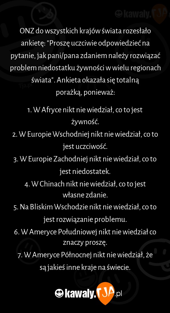 ONZ do wszystkich krajów świata rozesłało ankietę: "Proszę uczciwie odpowiedzieć na pytanie, jak pani/pana zdaniem należy rozwiązać problem niedostatku żywności w wielu regionach świata". Ankieta okazała się totalną porażką, ponieważ: