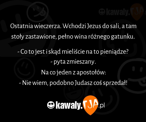 Ostatnia wieczerza. Wchodzi Jezus do sali, a tam stoły zastawione, pełno wina różnego gatunku. - Co to jest i skąd mieliście na to pieniądze? - pyta zmieszany. Na co jeden z apostołów: - Nie wiem, podobno Judasz coś sprzedał!
