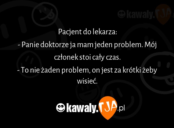 Pacjent do lekarza: - Panie doktorze ja mam jeden problem. Moj czlonek stoi caly czas. - To nie zaden problem, on jest za krotki zeby wisiec.