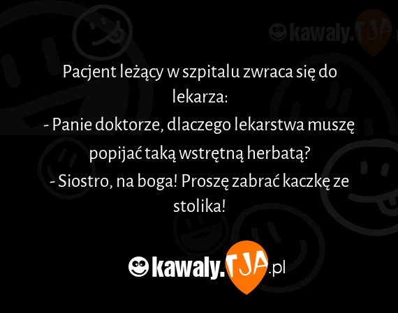 Pacjent leżący w szpitalu zwraca się do lekarza: - Panie doktorze, dlaczego lekarstwa muszę popijać taką wstrętną herbatą? - Siostro, na boga! Proszę zabrać kaczkę ze stolika!