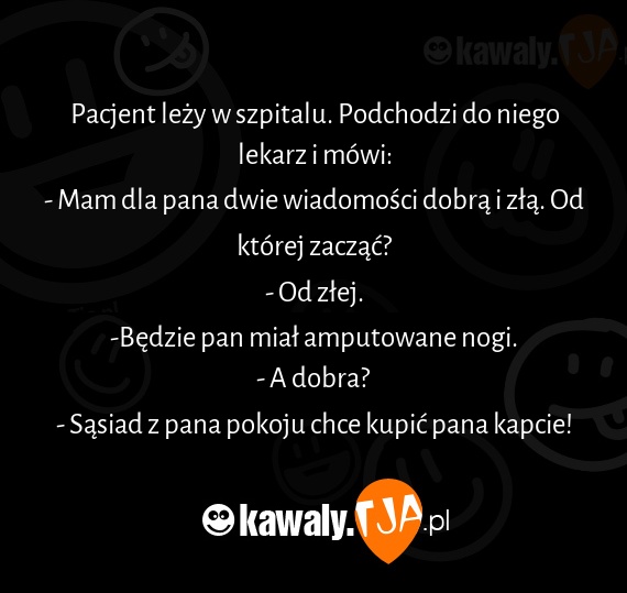 Pacjent lezy w szpitalu. Podchodzi do niego lekarz i mowi: - Mam dla pana dwie wiadomosci dobra i zla. Od ktorej zaczac? - Od zlej. -Bedzie pan mial amputowane nogi. - A dobra? - Sasiad z pana pokoju chce kupic pana kapcie!
