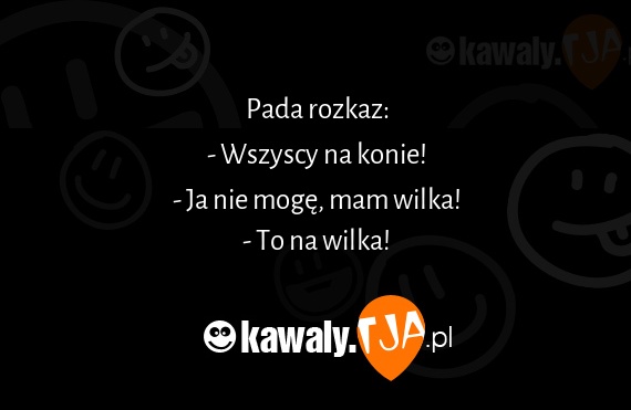 Pada rozkaz: - Wszyscy na konie! - Ja nie mogę, mam wilka! - To na wilka!