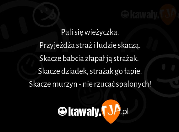 Pali się wieżyczka. Przyjeżdża straż i ludzie skaczą. Skacze babcia złapał ją strażak. Skacze dziadek, strażak go łapie. Skacze murzyn - nie rzucać spalonych!
