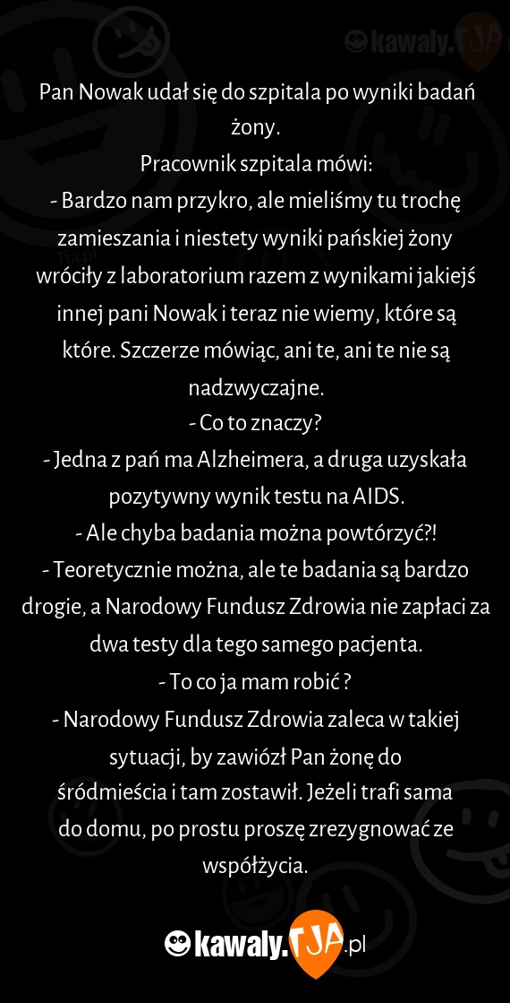 - Bardzo nam przykro, ale mieliśmy tu trochę zamieszania i niestety wyniki pańskiej żony wróciły z laboratorium razem z wynikami jakiejś innej pani Nowak i teraz nie wiemy, które są które. Szczerze mówiąc, ani te, ani te nie są nadzwyczajne.