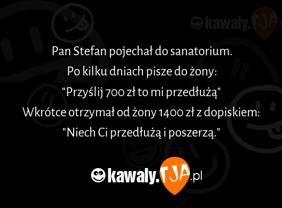 Pan Stefan pojechał do sanatorium. Po kilku dniach pisze do żony: "Przyślij 700 zł to mi przedłużą" Wkrótce otrzymał od żony 1400 zł z dopiskiem: "Niech Ci przedłużą i poszerzą."