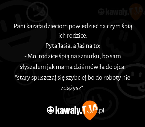 Pani kazala dzieciom powiedziec na czym spia ich rodzice. Pyta Jasia, a Jas na to: - Moi rodzice spia na sznurku, bo sam slyszalem jak mama dzis mowila do ojca: "stary spuszczaj sie szybciej bo do roboty nie zdazysz".