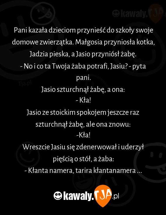 Pani kazała dzieciom przynieść do szkoły swoje domowe zwierzątka. Małgosia przyniosła kotka, Jadzia pieska, a Jasio przyniósł żabę.