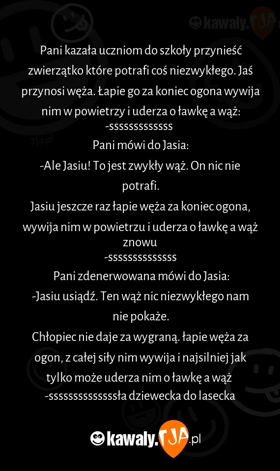 Pani kazała uczniom do szkoły przynieść zwierzątko które potrafi coś niezwykłego. Jaś przynosi węża. Łapie go za koniec ogona wywija nim w powietrzy i uderza o ławkę a wąż: